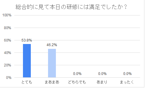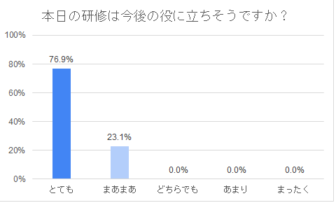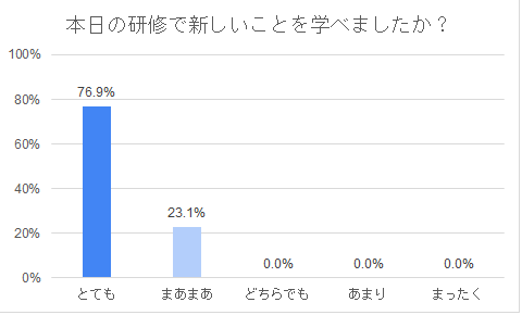 - 研修時間が各分野45分であったため、基礎的な内容に留まってしまった。